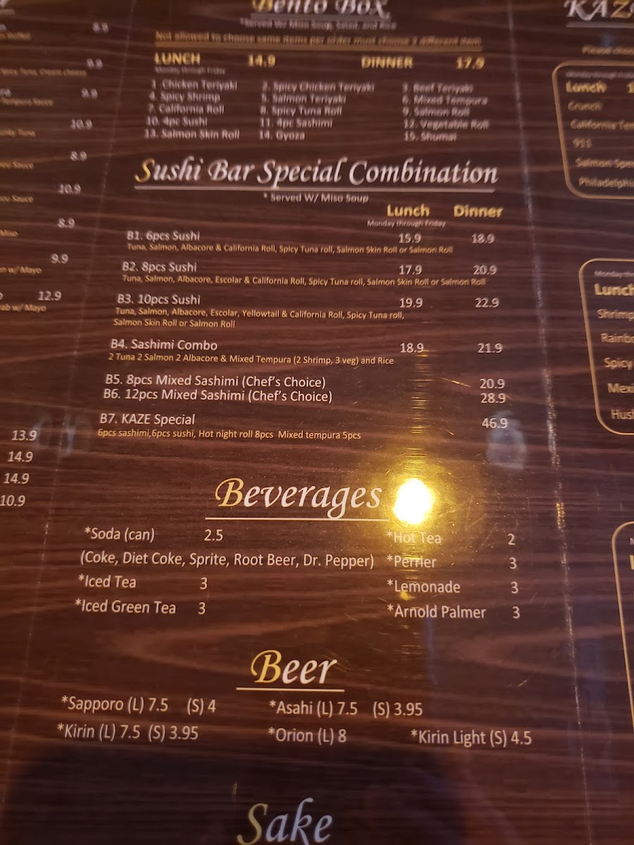 Beverages: Drink selections include traditional options like iced green tea and alcoholic beverages such as Sapporo beer. Non-alcoholic canned sodas are also available.